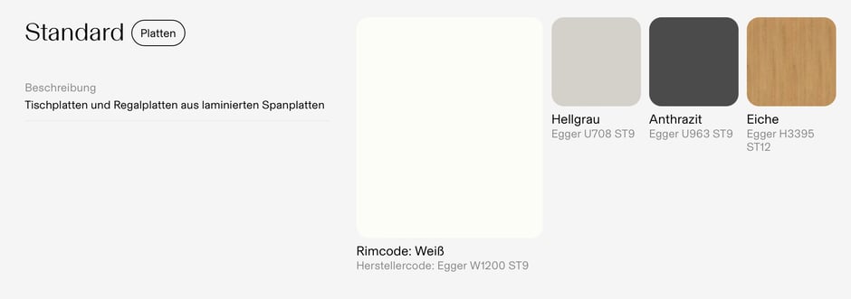Weiss W1000, Hellgrau U708, Anthrazit U963, Eiche H3395.