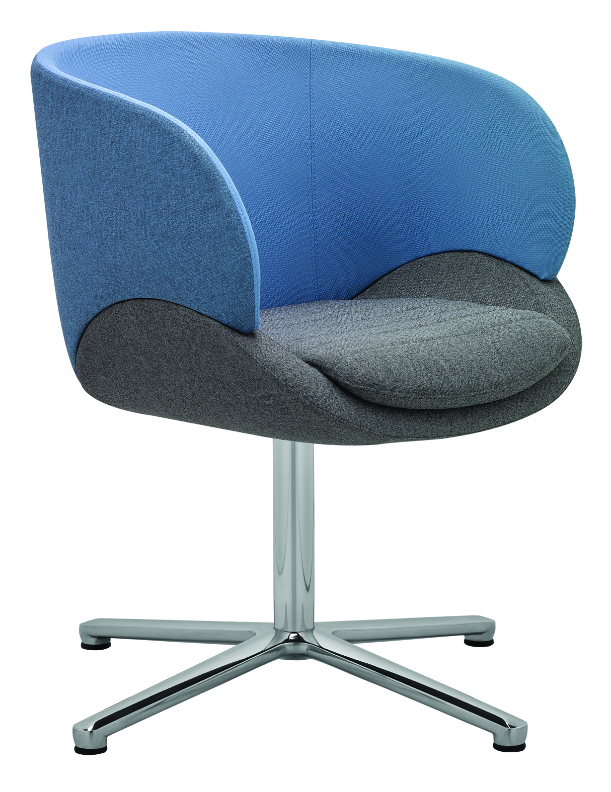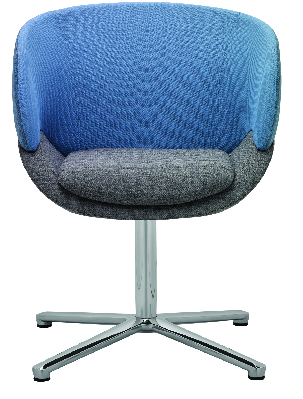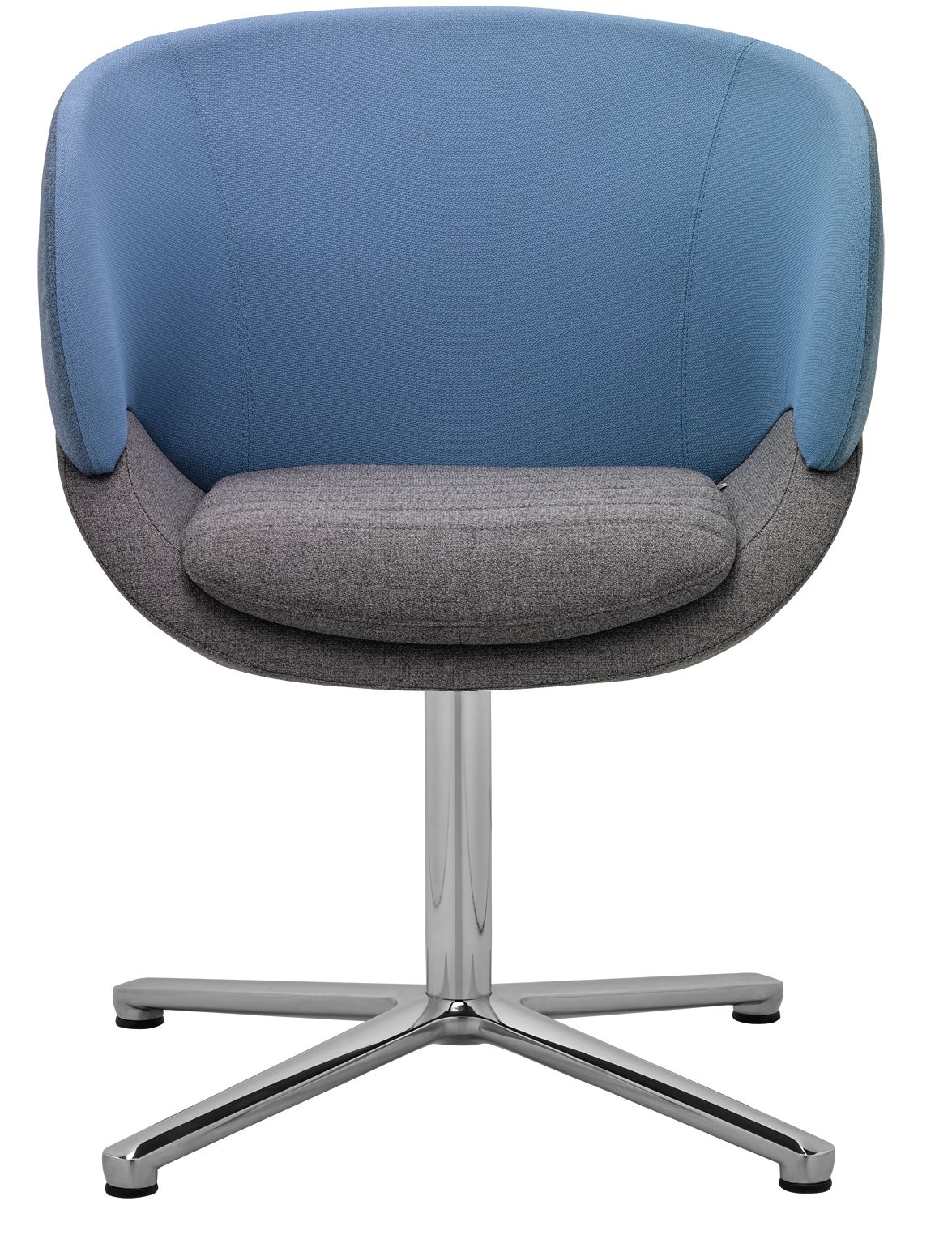 Der Sessel steht auf einer runden Stahlsäule mit einem hochwertigen Vier-Sterne-Fuss, wahlweise schwarz pulverbeschichtet oder in einer edlen polierten Alu-Chrom-Kombination. Diese stabile und zugleich elegante Basis macht den CV 870.01 ideal für Büros, Loungebereiche und moderne Empfangszonen.