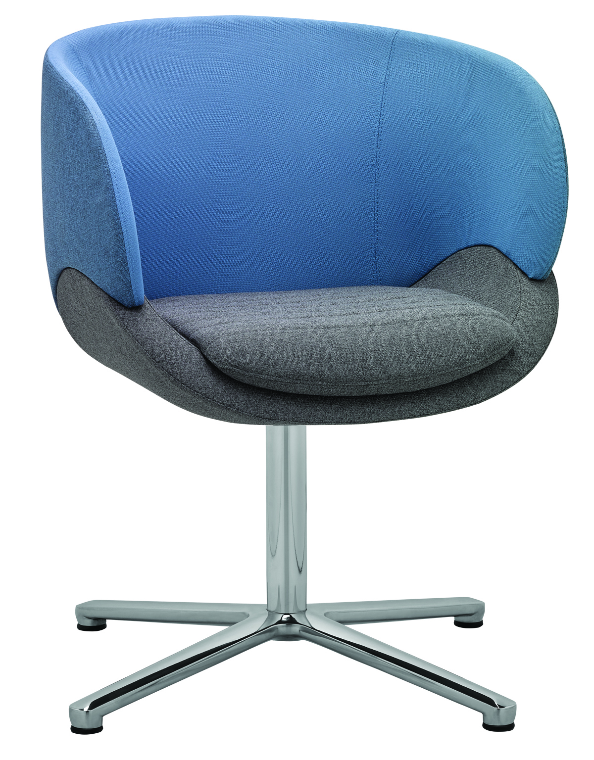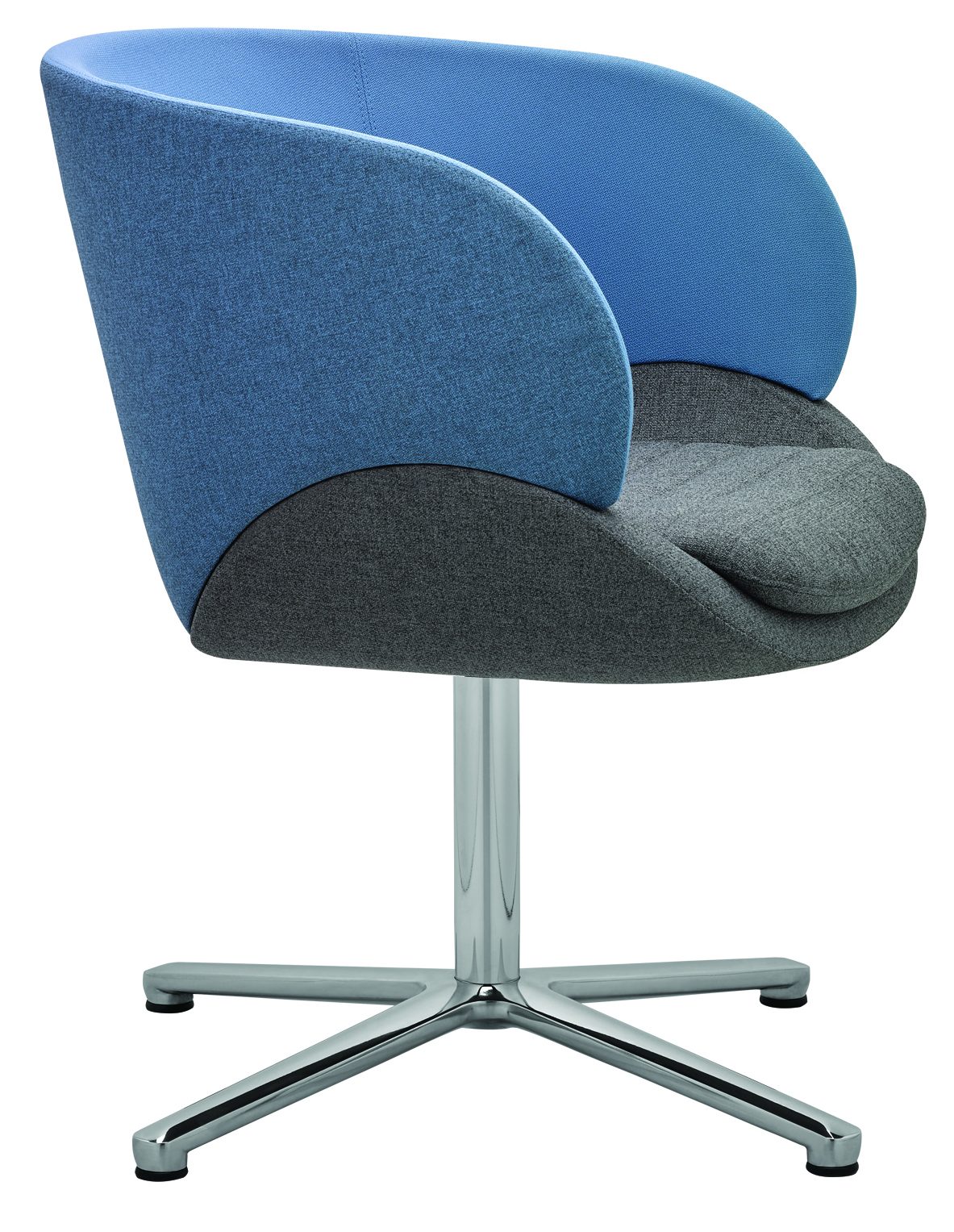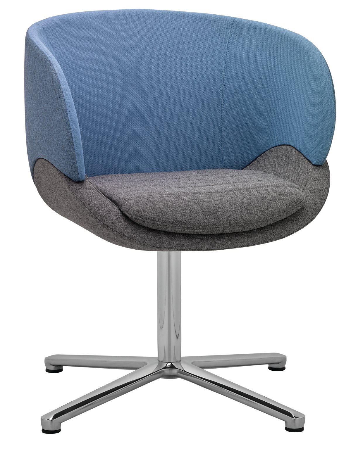 Der Sessel steht auf einer runden Stahlsäule mit einem hochwertigen Vier-Sterne-Fuss, wahlweise schwarz pulverbeschichtet oder in einer edlen polierten Alu-Chrom-Kombination. Diese stabile und zugleich elegante Basis macht den CV 870.01 ideal für Büros, Loungebereiche und moderne Empfangszonen.
