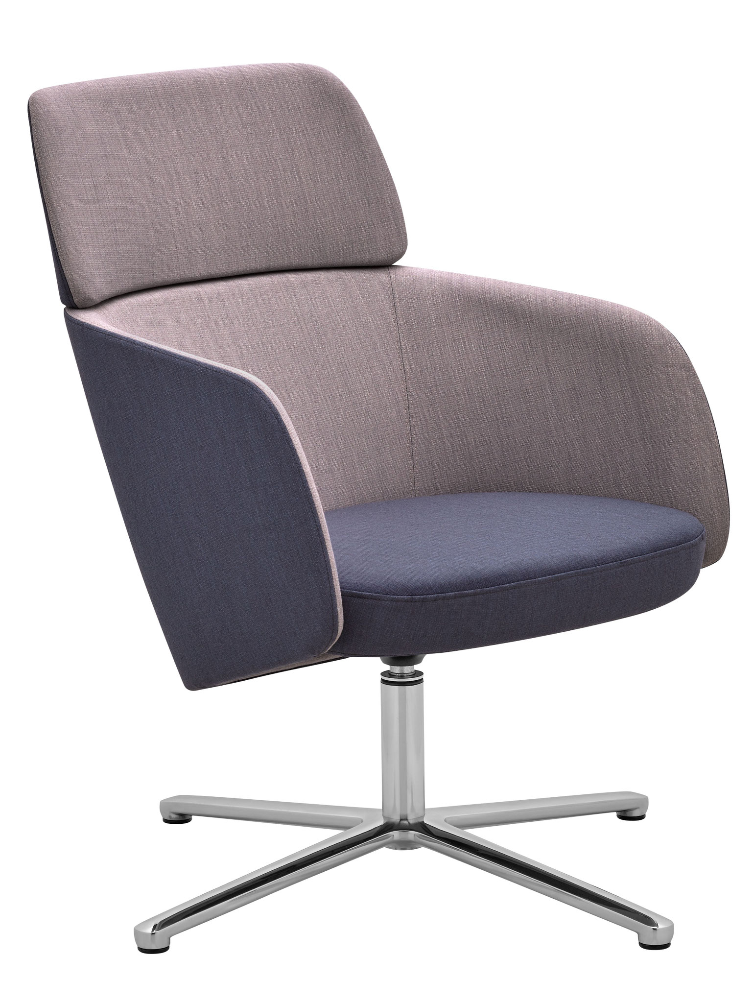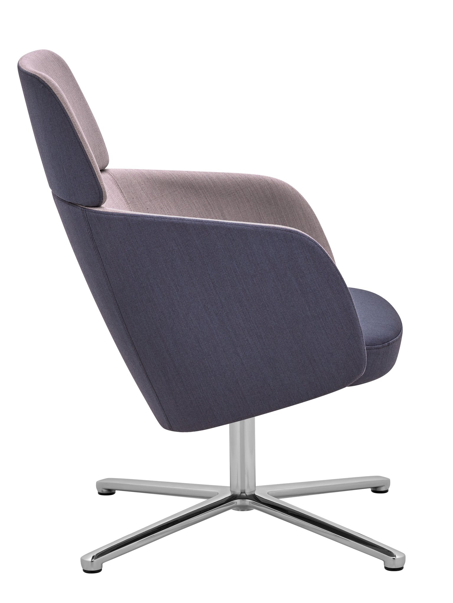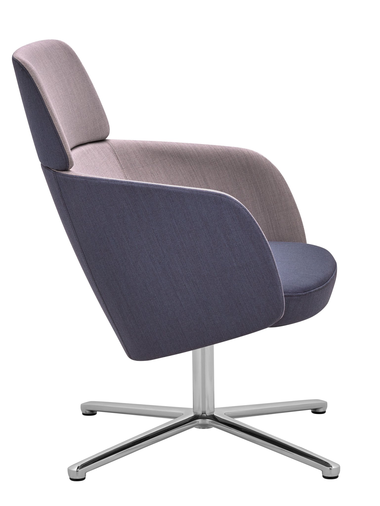 Der Sessel steht auf einem Zentralfuss mit drehbarer SW2-Mechanik und einem vierarmigen Kreuzgestell, wahlweise in Schwarz oder als Kombination aus poliertem Aluminium und Chrom erhältlich.