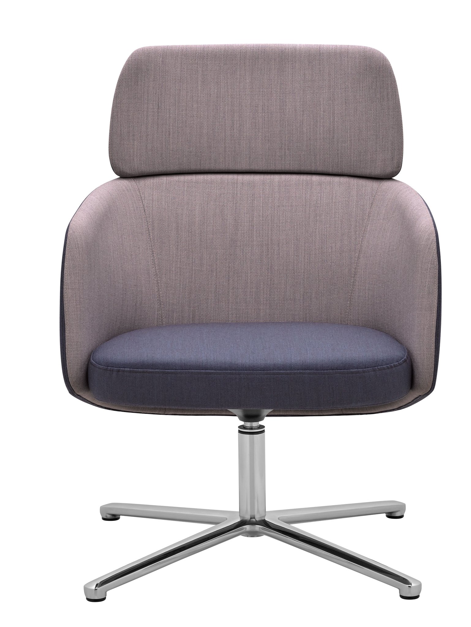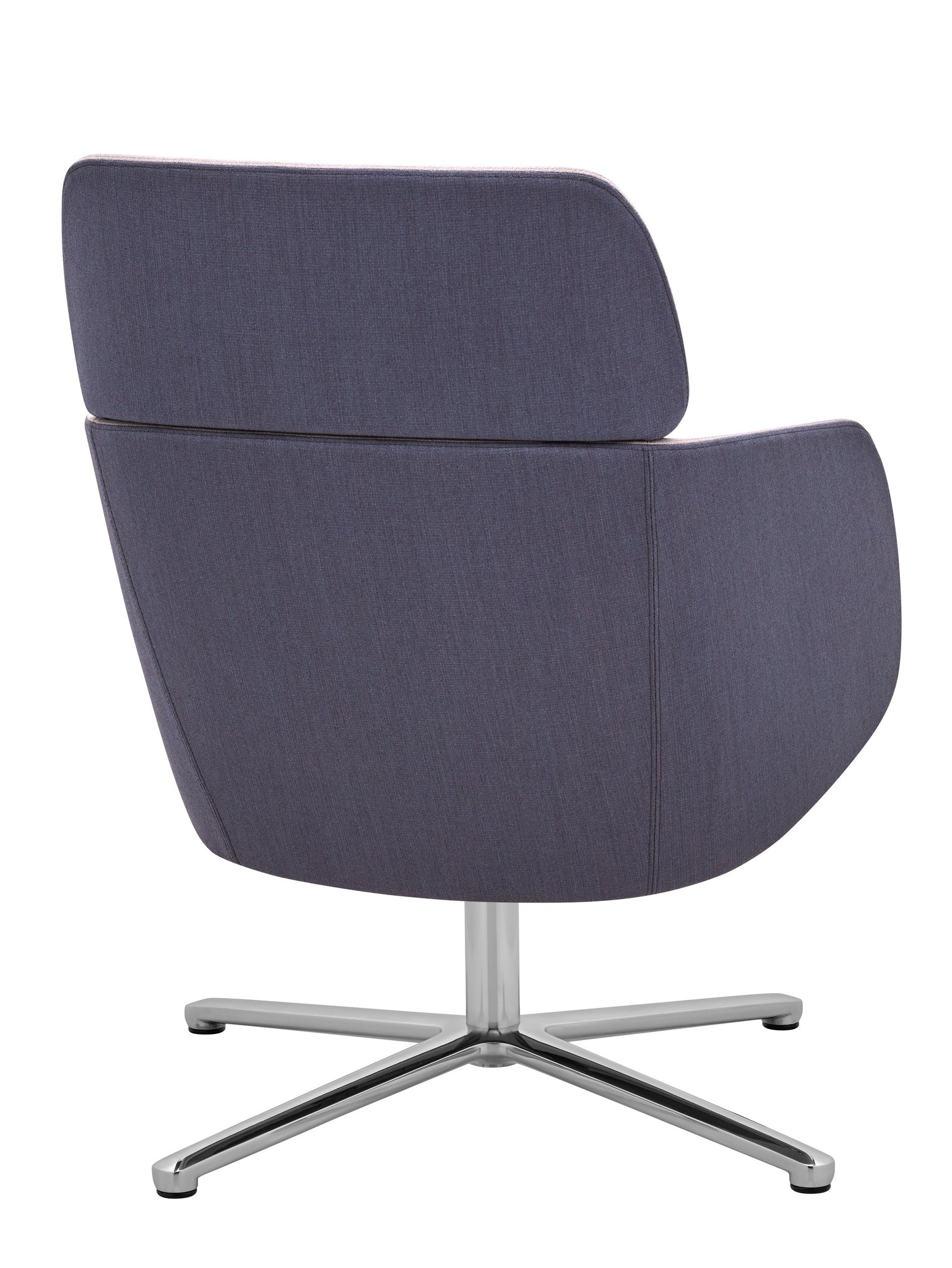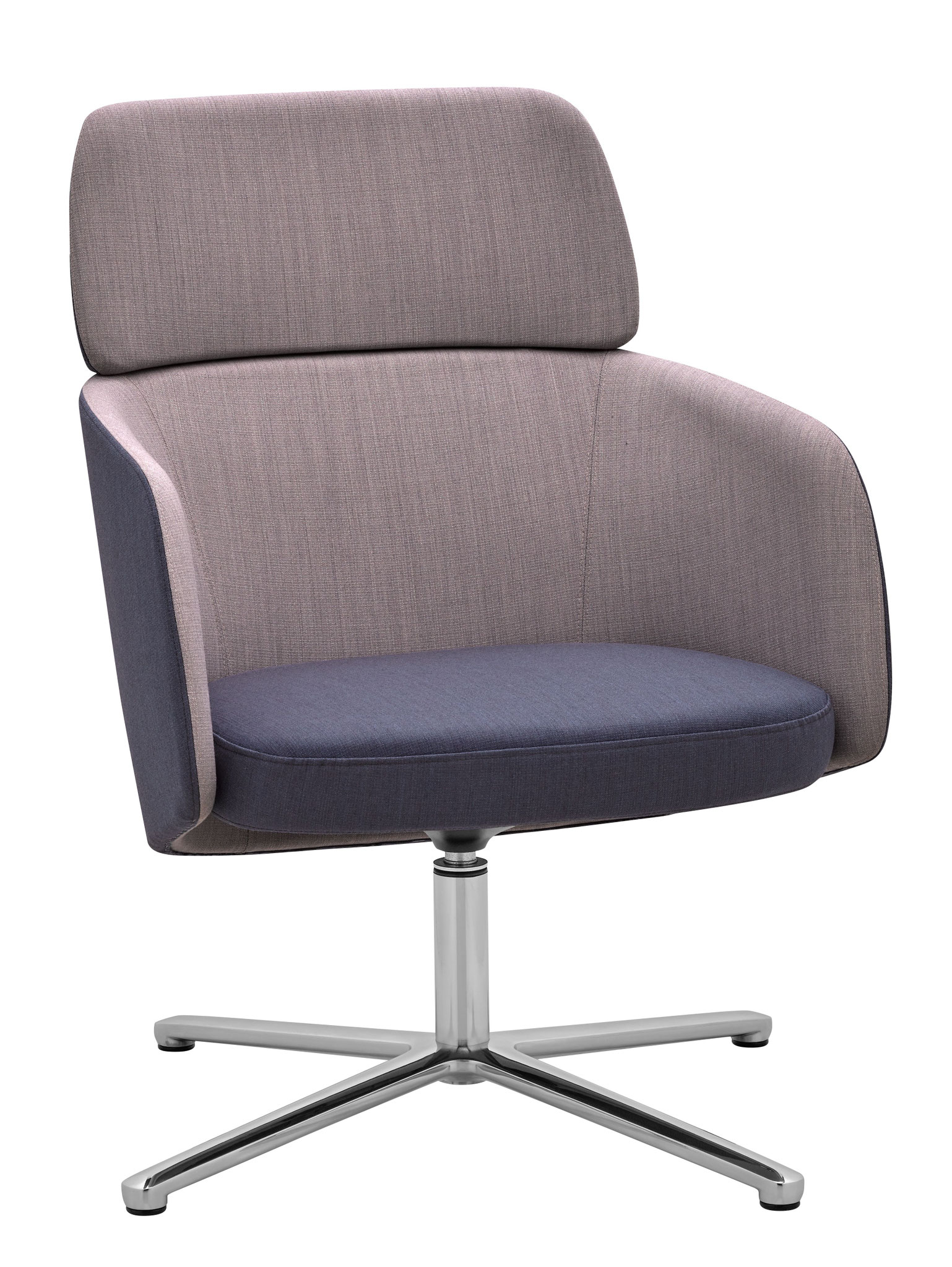 Der Sessel steht auf einem Zentralfuss mit drehbarer SW2-Mechanik und einem vierarmigen Kreuzgestell, wahlweise in Schwarz oder als Kombination aus poliertem Aluminium und Chrom erhältlich.
