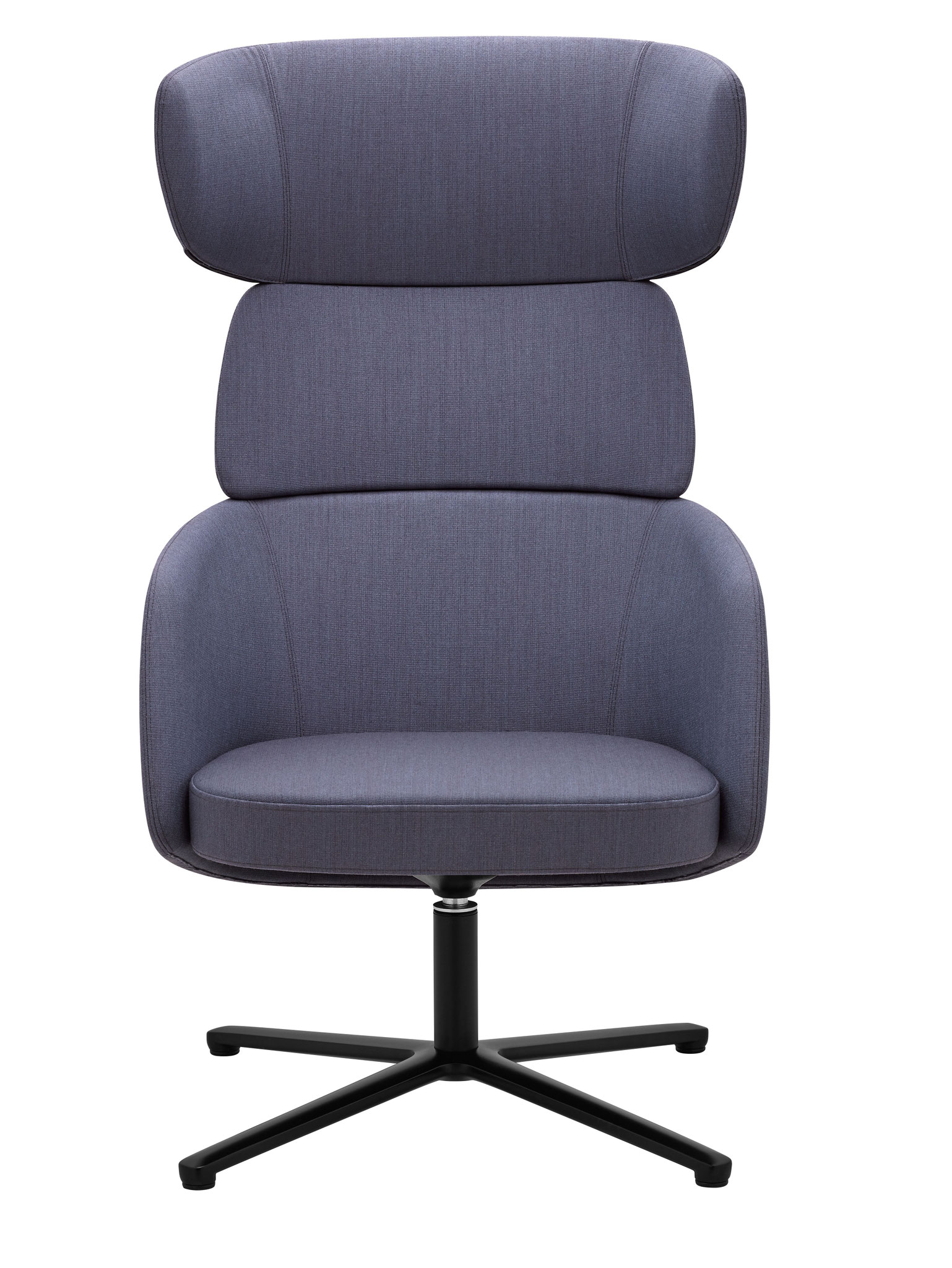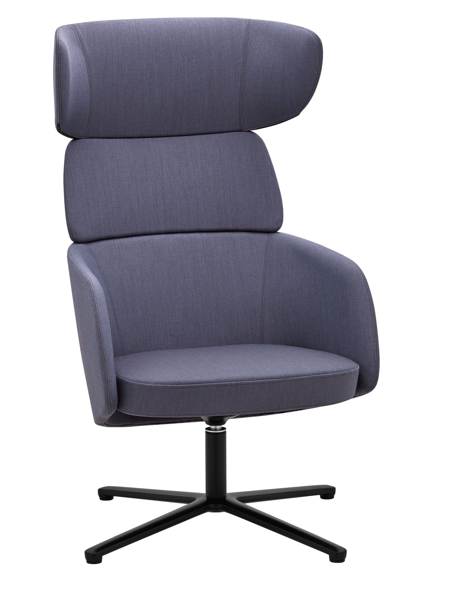 Der Sessel steht auf einem Zentralfuss mit drehbarer SW2-Mechanik und einem vierarmigen Kreuzgestell, wahlweise in Schwarz oder als Kombination aus poliertem Aluminium und Chrom erhältlich.